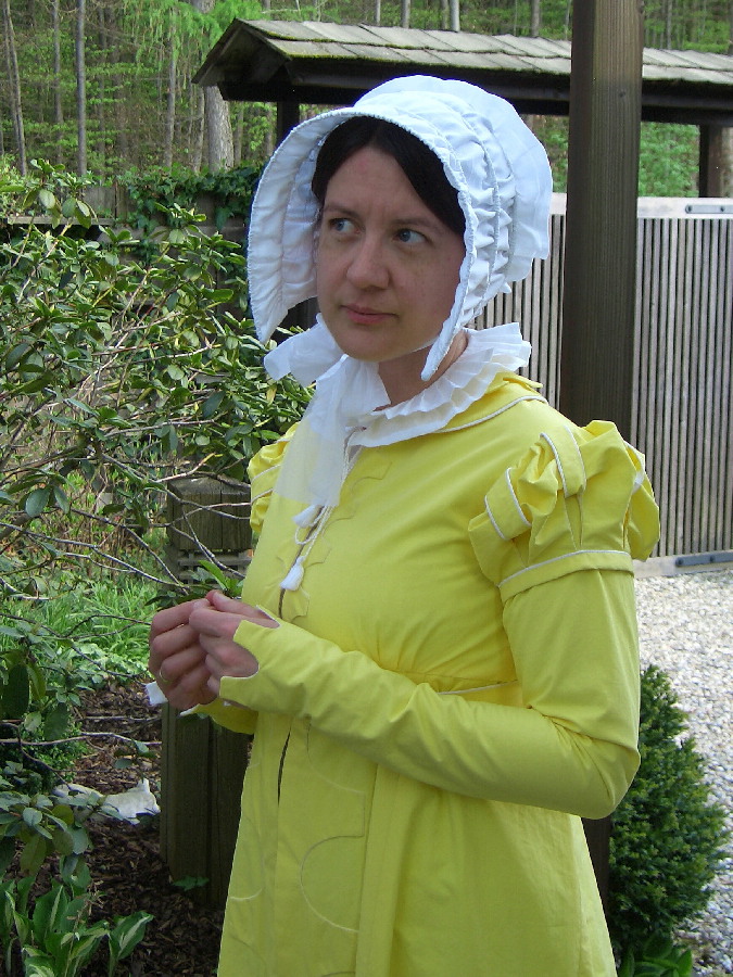 I worked according to a fashion plate from the 1812's Costume Parisien. The capote de perkale is shown there in several different styles (No.3).