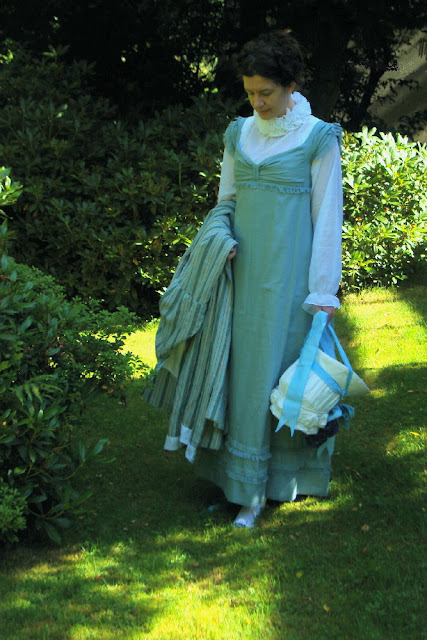 With this dress I'm also wearing a chemisette, a chemise (or shirt), a pair of stays, a petticoat, white stockings, a hat and a linen pelisse.