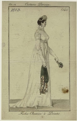 My first desperate search for an explanation of the fashion plate led me into nothingness and the term itself revealed a later fashion plate from the Journal des dames et des modes, which was dated to 1804 (don't get confused by the marked date, actually that number of the Costume Parisien plate corresponds in our calendar system with March 1804).