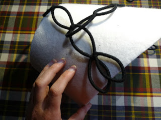 My search for matching chain pieces, which wouldn't add too much weight on the headwear, remained unsuccessful, furthermore I had the impression that the chain in the plate seems soft and not metall made, hence I've decided on a wire, which was wrapped with woolen thread.