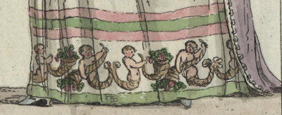 [...]der Rock hat unten eine breite Bordüre von rosa und grünem Bande, und eine sehr lebhaft colorirte gemahlte Arabesque, Kinder die halb Delphin sind, und mit Fruchthörnern spielen[...]