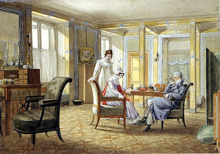 While the fashion concerning garments usually changed quite quickly in the years between 1795-1820, furnitures and the interior often meant a longterm and even lifelong commitment. A fine reason to take a comfy walk from your armchair through a variety of so-called "Zimmerbilder" of artists (which were common from the 1820s onwards), which give an impression of the way people would live from the 1795-1820s also.